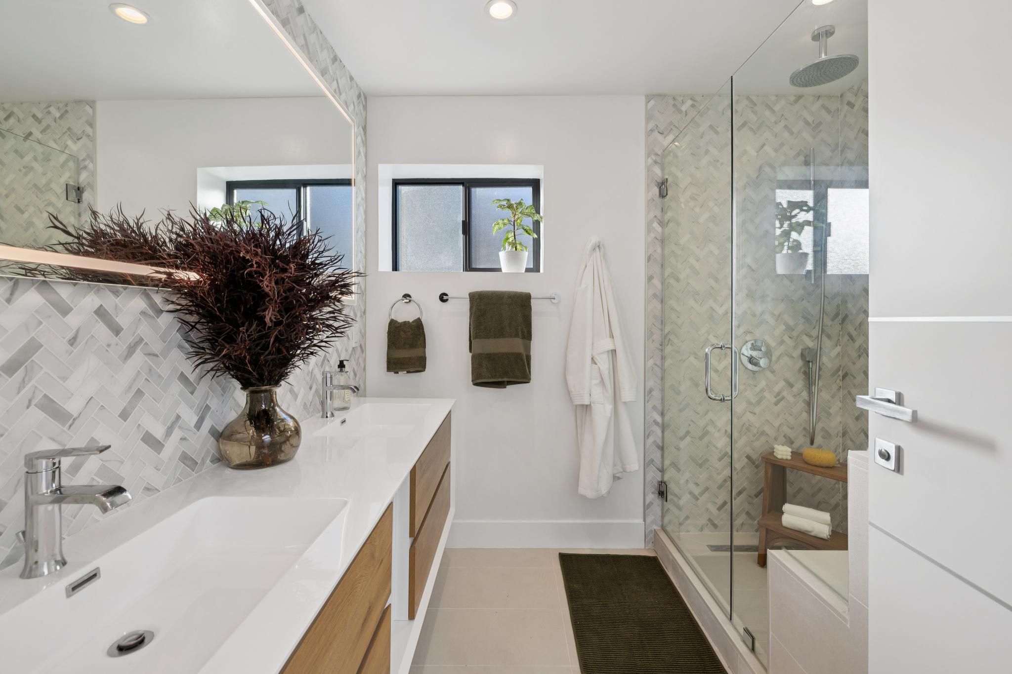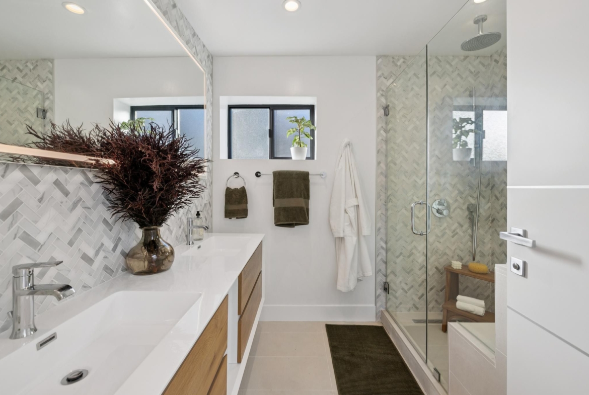 Premium Fixtures: The bathroom is equipped with both a luxury soaking bathtub and a separate glass-enclosed walk-in shower, offering a spa-like retreat within the home.