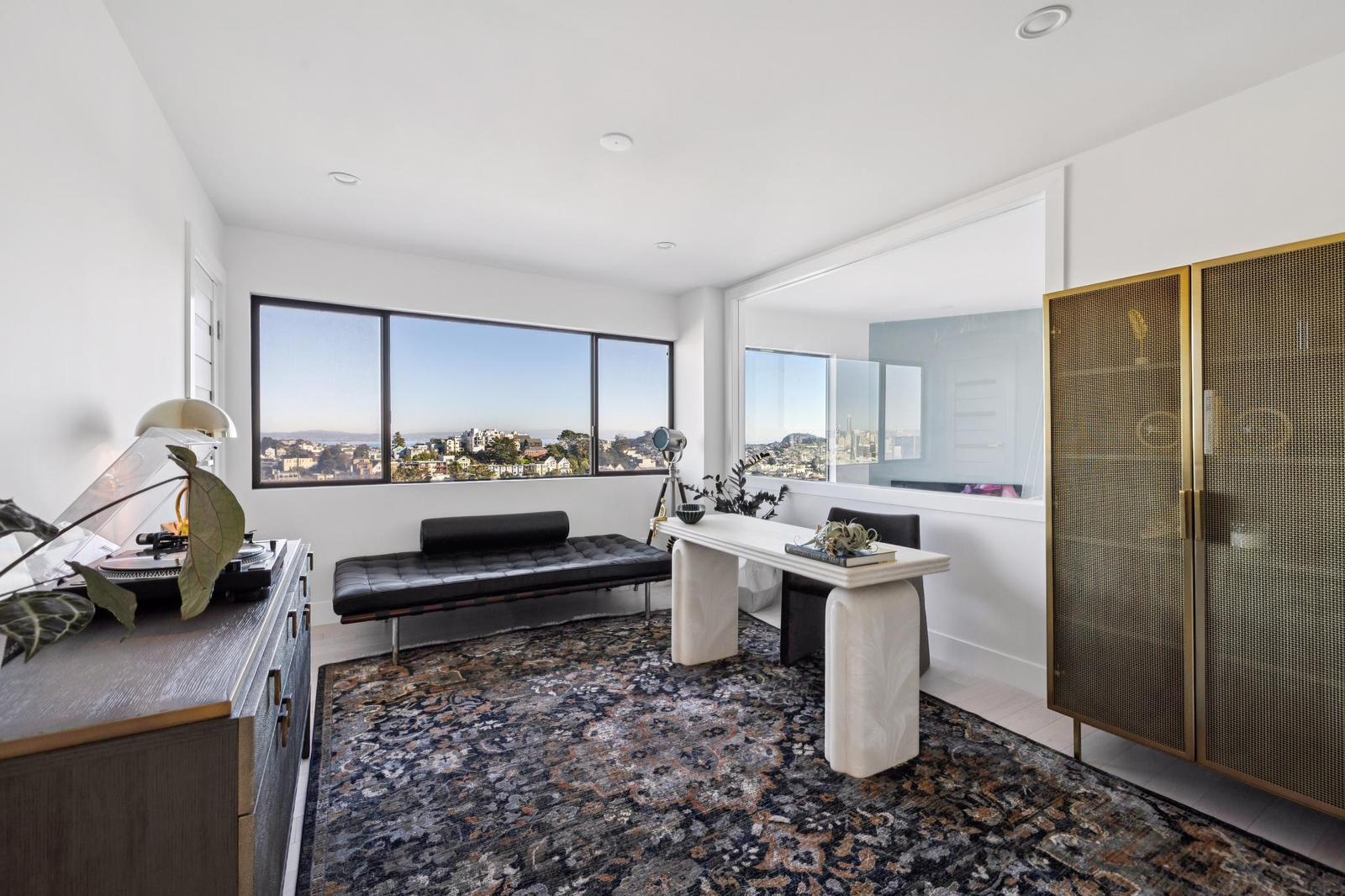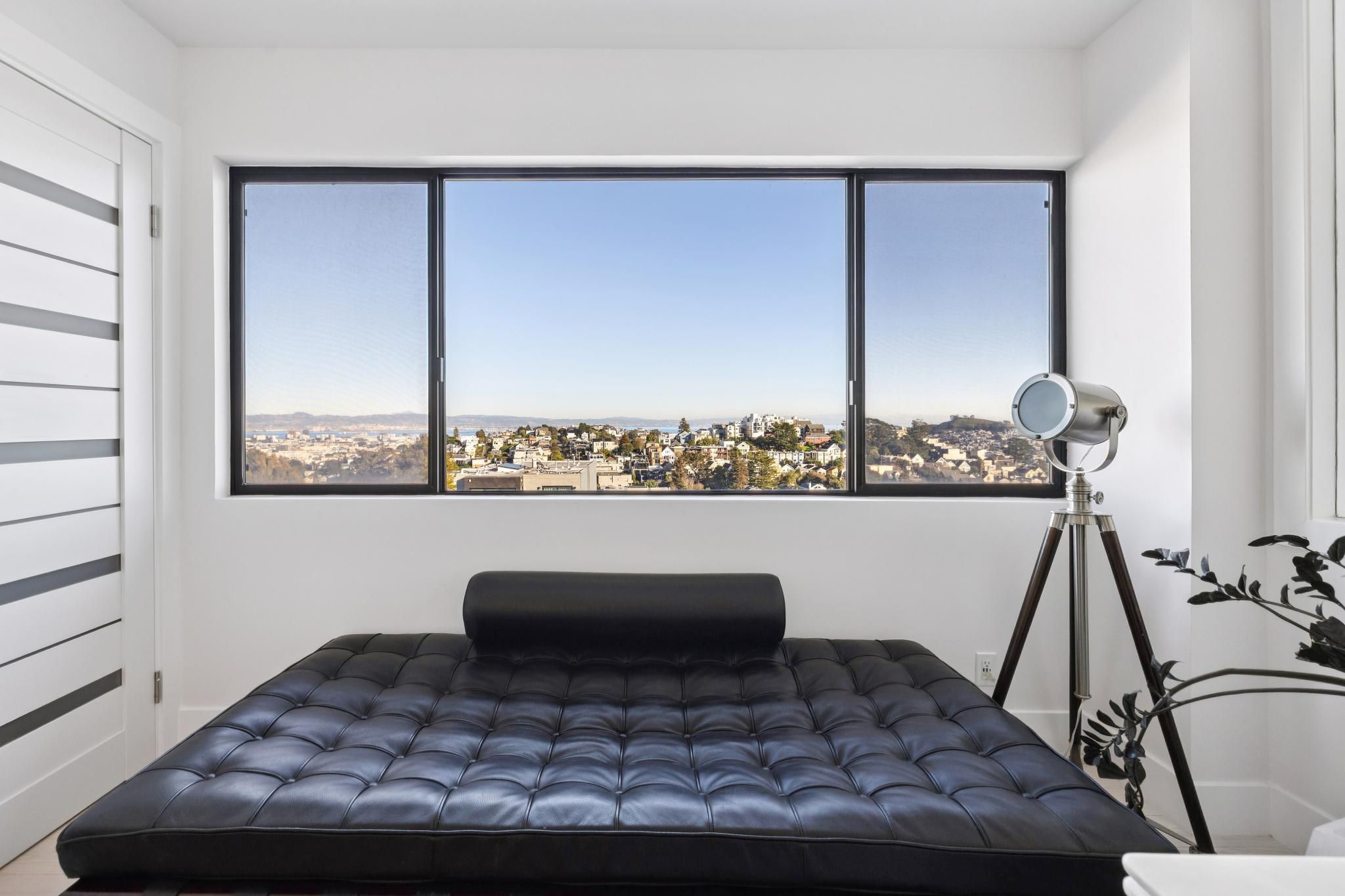 Grand Primary Bedroom (West Wing): A sprawling suite encompassing the left side of the floor plan. Large windows provide dual-aspect lighting and views toward the San Francisco skyline.